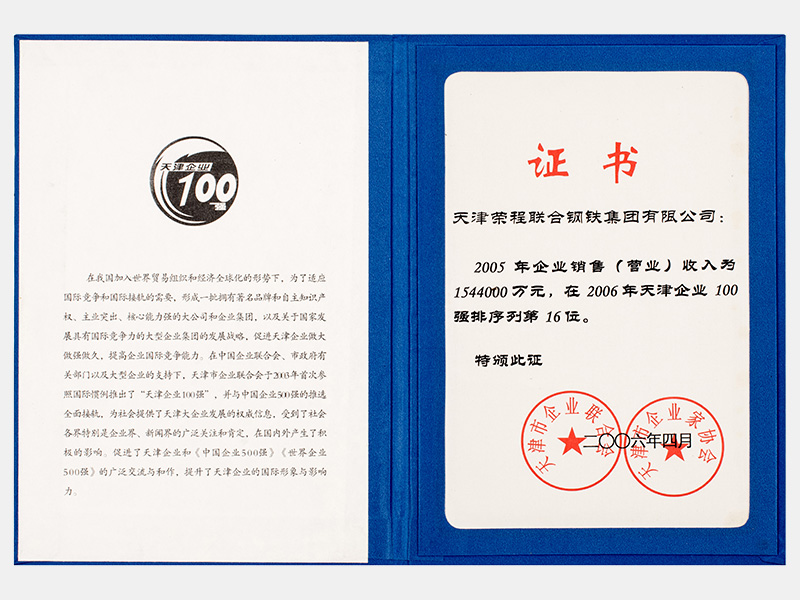 2005年企業(yè)銷售(營業(yè))收入為1544000萬元,在2006年天津企業(yè)100強排序列第16位